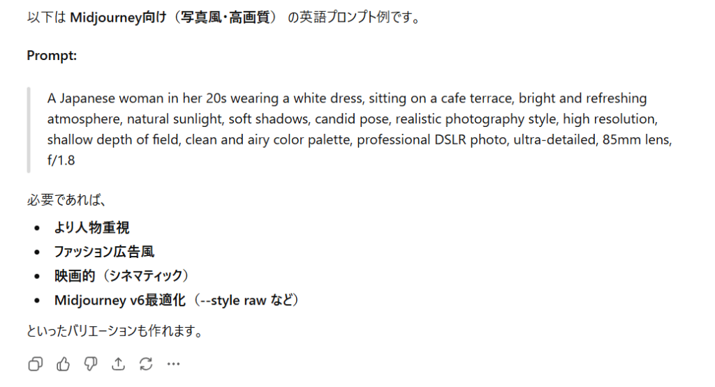 ③クライアントワークでは事前確認を:企業案件やクライアントワークでMidjourneyを使う場合は、事前にAI生成画像の使用について確認を取っておくと安心です。「AI生成画像はNG」というクライアントもいるので、トラブルを避けるためにも事前確認が大切ですね。