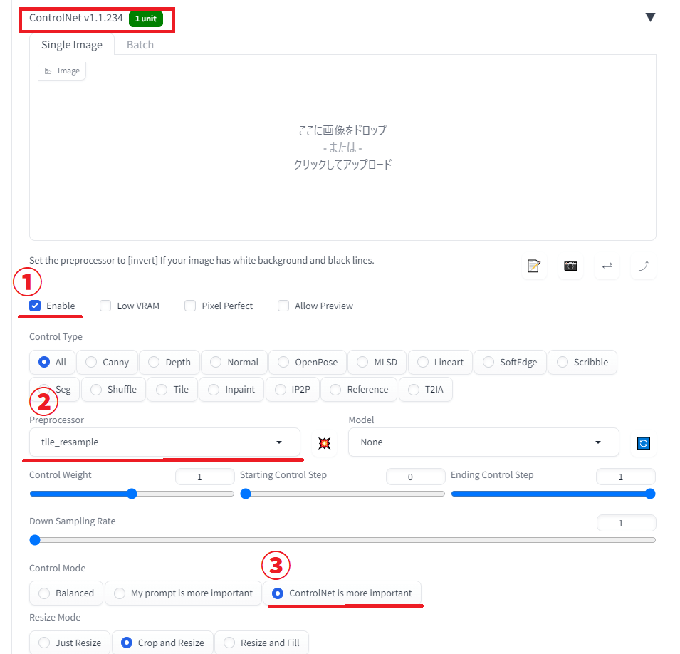 次にControlNetを開き、以下の画像に従って設定を変更します。