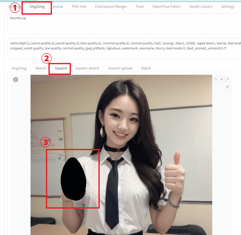 『Inpaint』で手や指を修正する方法は、以下の画像の手順でおこなっていってください。