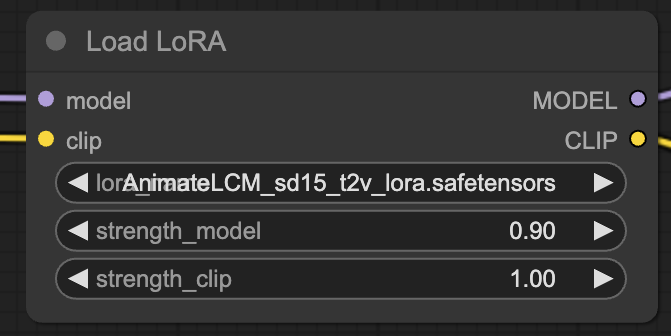 使用するLoRaとして、先ほどダウンロードした「AnimateLCM_sd15_t2v_lora.safetensors」を選択します。