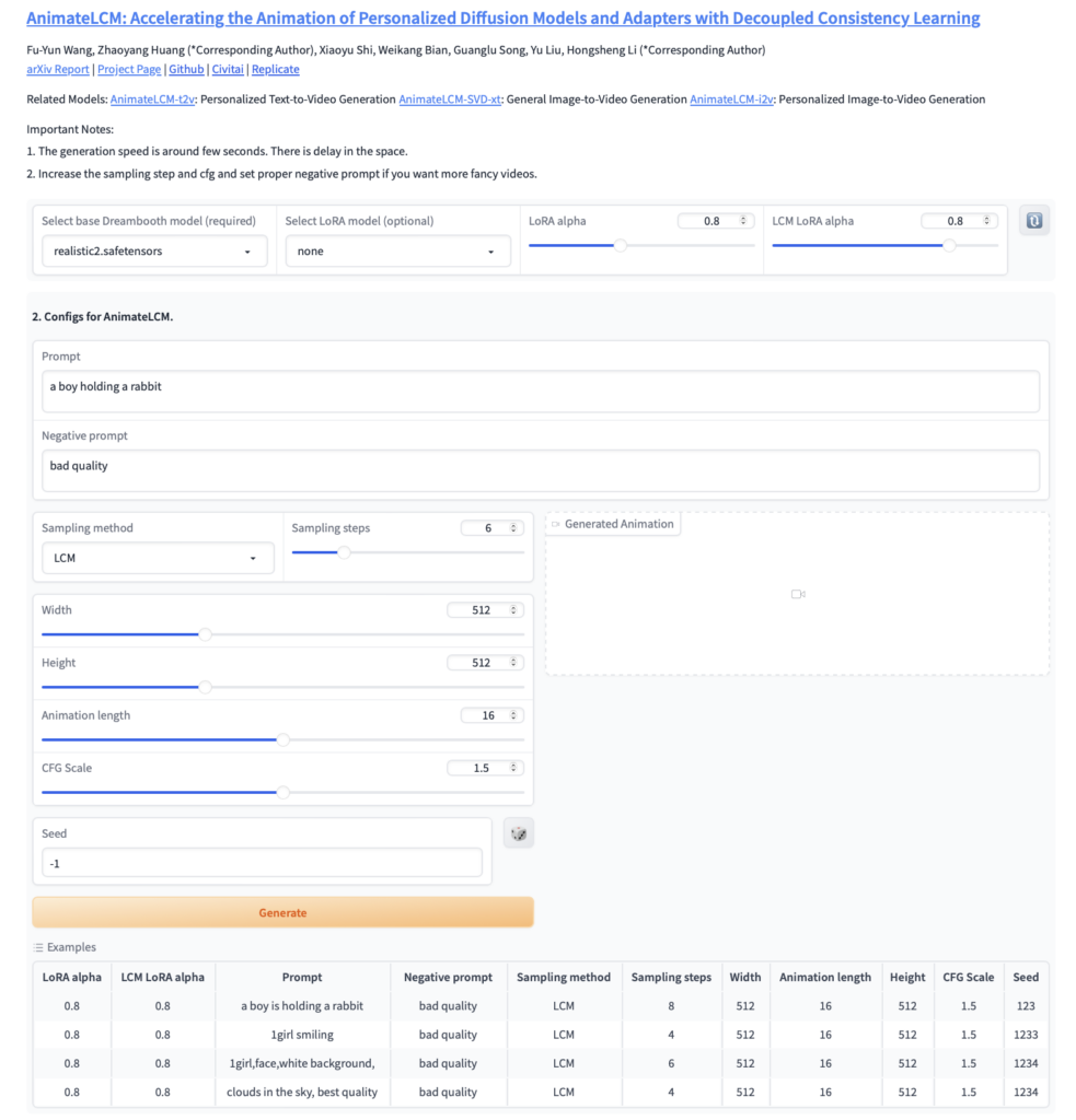 HuggingFace上には、Animate LCMのデモ版が公開されており、インストール不要で利用することが可能です。