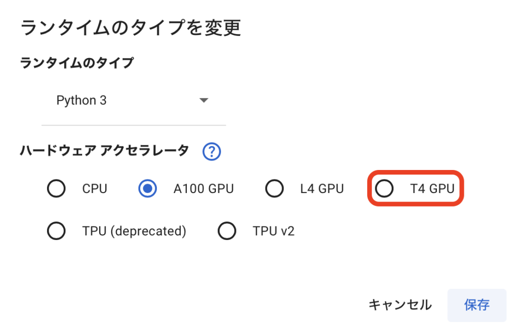 Colabでノートブックを新規作成してランタイムのタイプを「Python 3」、ハードウェアアクセラレータを「T4 GPU」に変更します。(私はコンピューティングユニットが余っているのでA100使っちゃいますが画像の生成はT4で十分動きます)