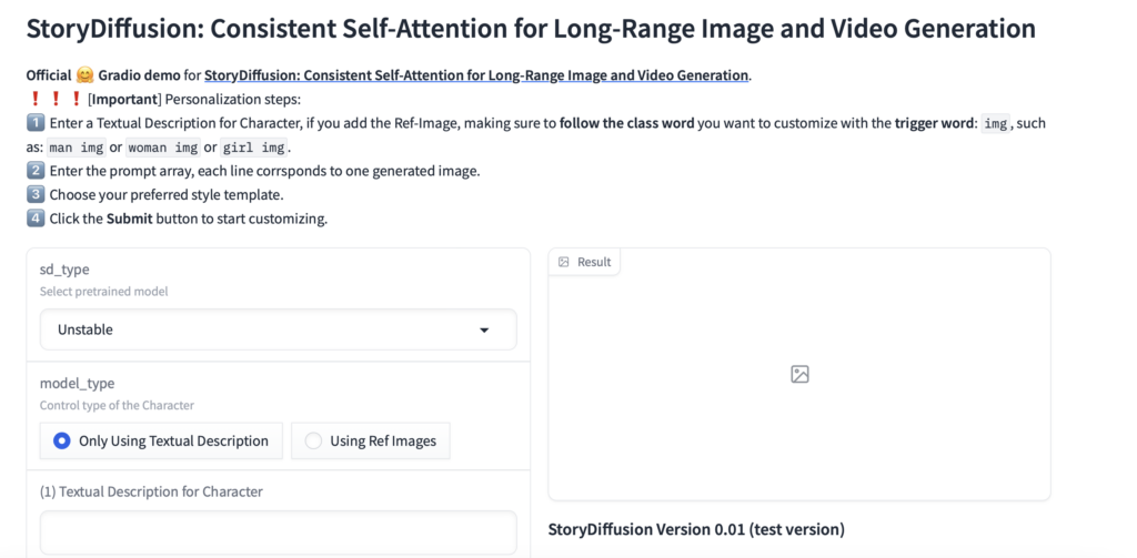 - 現在公開されている部分は動画生成に使用する複数枚の統一性を持った画像を生成する(Comic Generation)機能のみです。