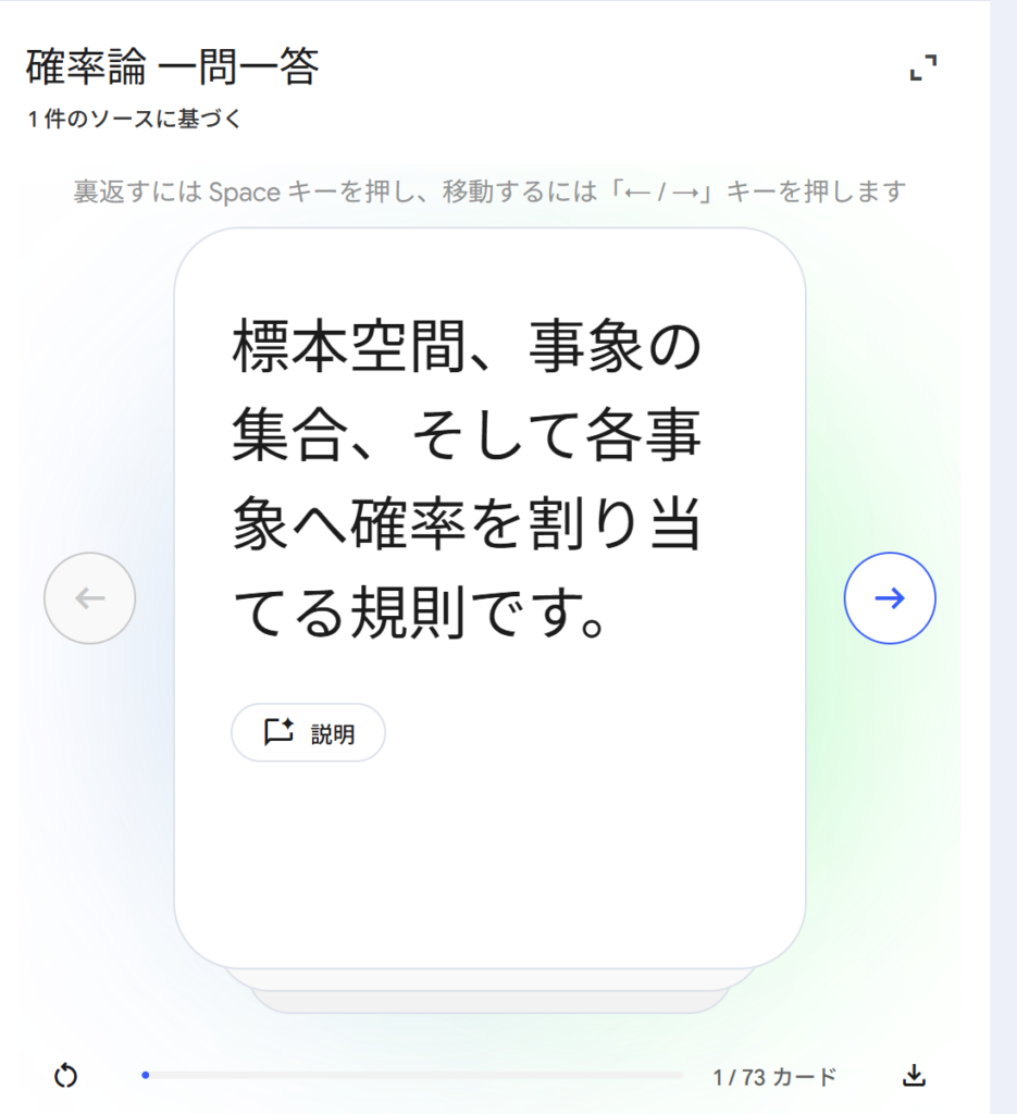 まずは大学の確率分野の授業資料を読み込ませて、一問一答のフラッシュカードを作ってみました。