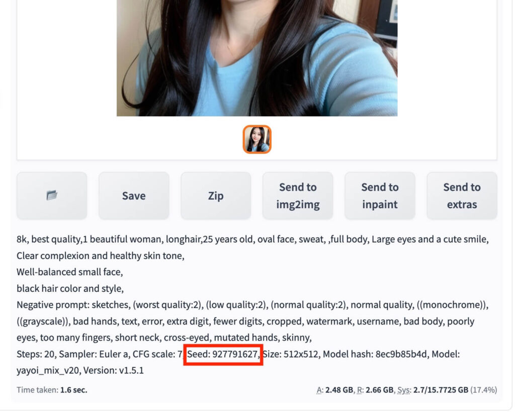 次に、生成した画像のSeed値を固定していきます。