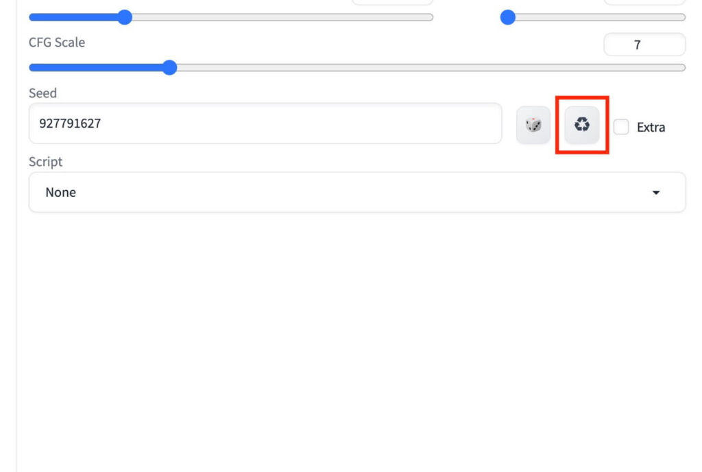 また、Seedと記載された枠の右側にあるリサイクルアイコンをクリックすると、Seed値が自動的にコピー&ペーストされ、Seed値の固定が完了します。