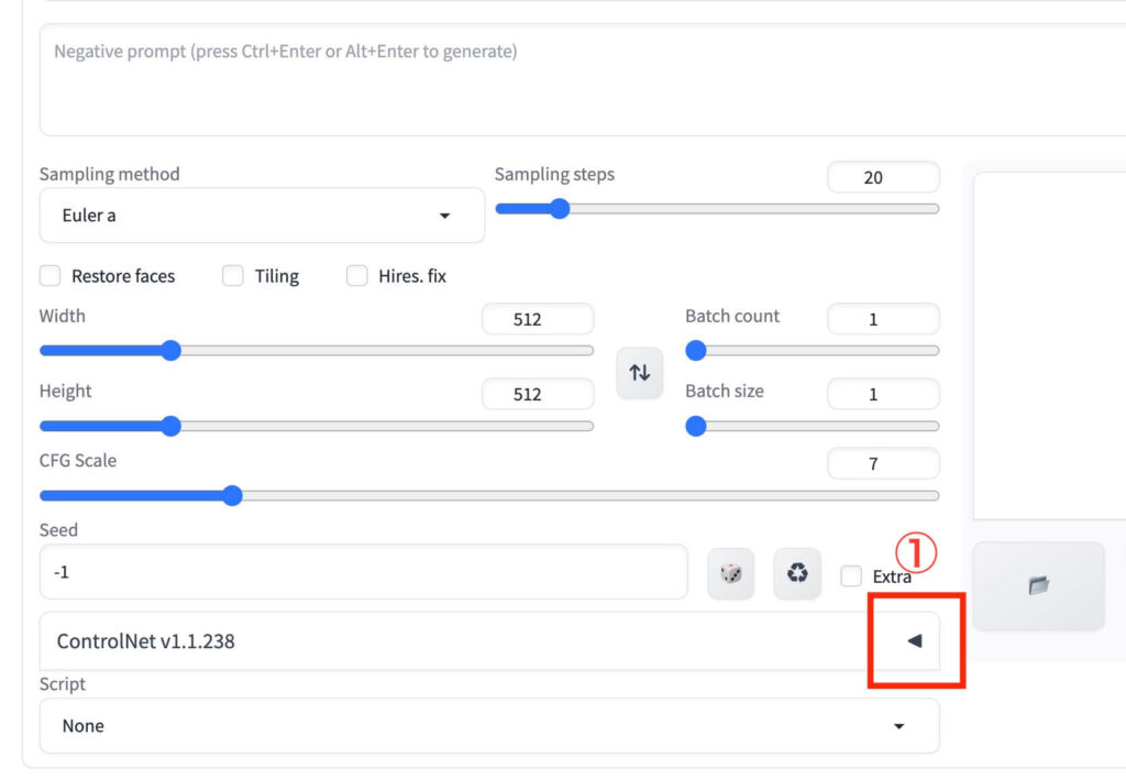 Stable Diffusionを起動したら『ControlNet』タブの右側にある「◀️」をクリックしてください。