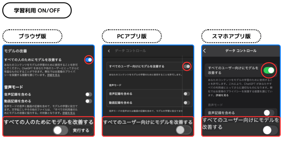- 【データ コントロール】内の「すべてのユーザー向けにモデルを改善する」トグルスイッチをオフにする