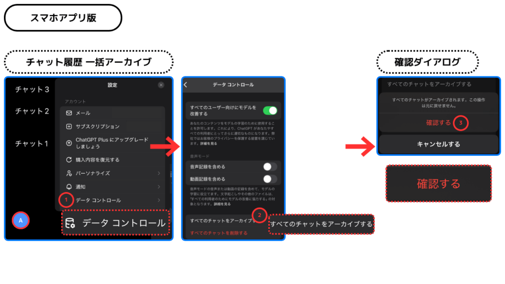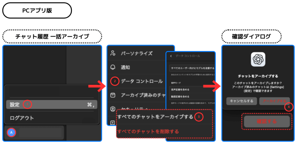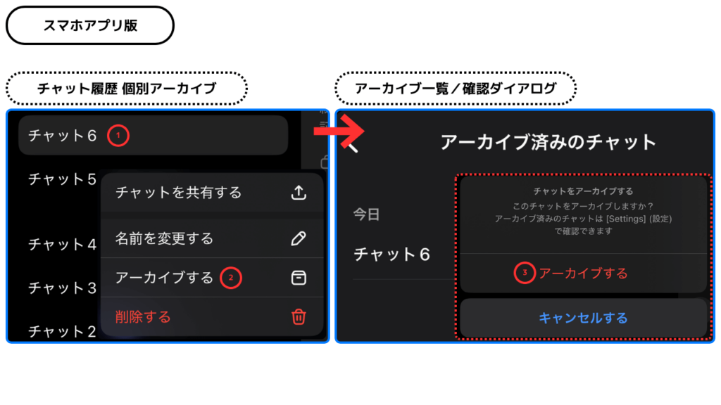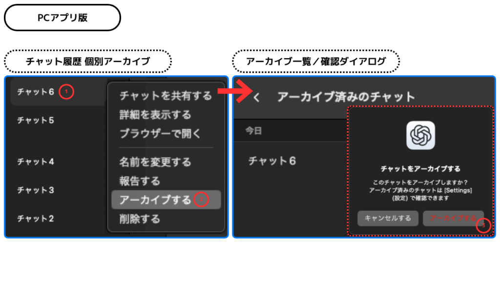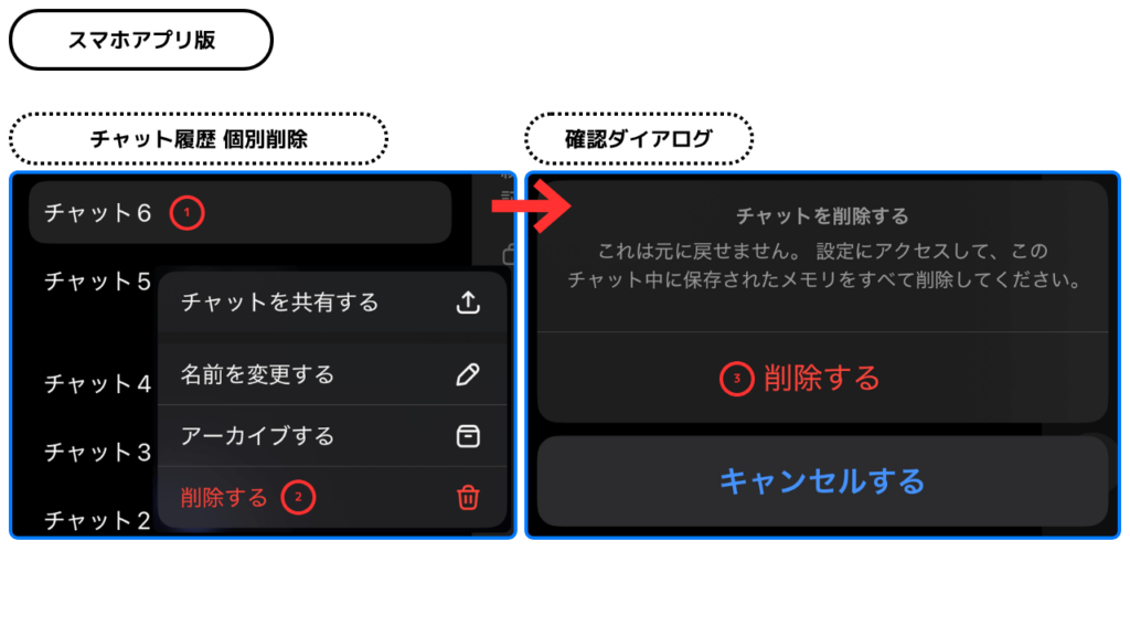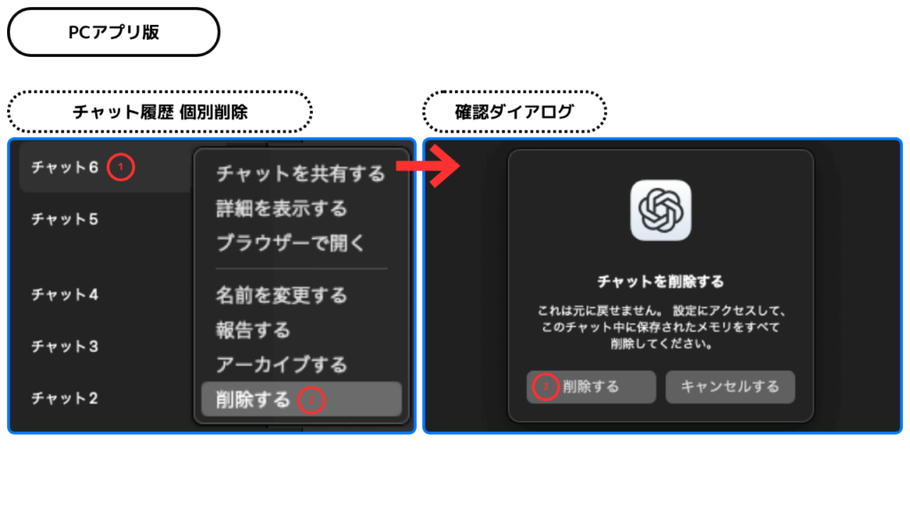 - ChatGPTにはゴミ箱がなく、履歴は削除と同時に復元不可となるため、重要な会話は事前に保存が必須