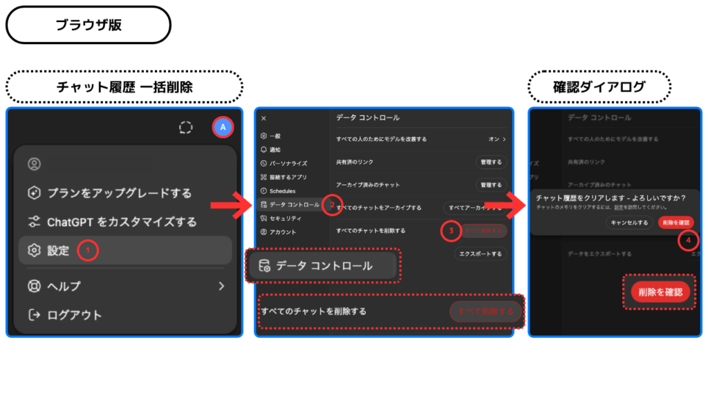 - 「データ コントロール」内の「すべてのチャットを削除する」項目で「すべて削除する」をクリック