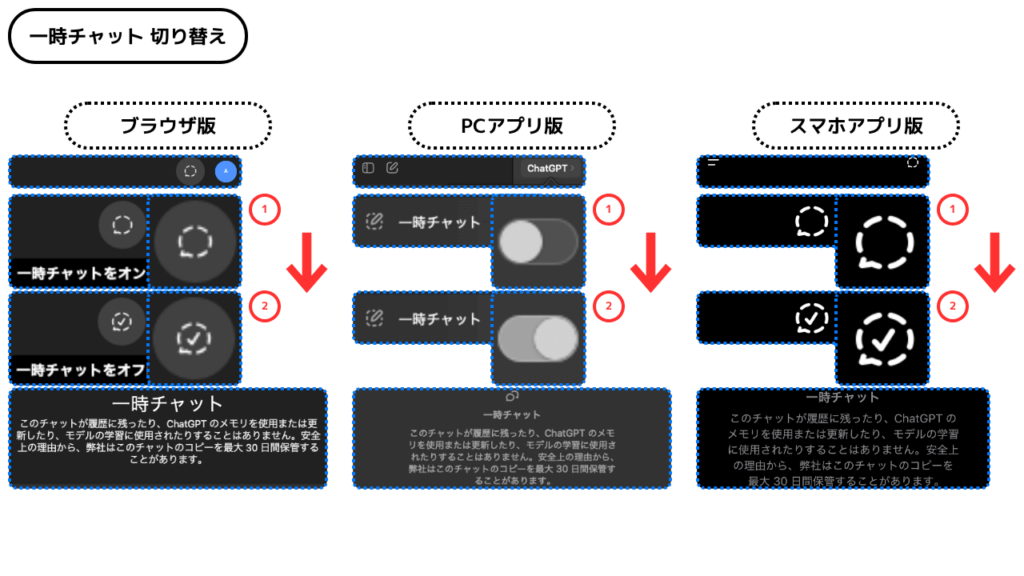 ただし、履歴が保存されない「一時チャット」では、セッション終了とともに会話内容が自動的に削除されます。