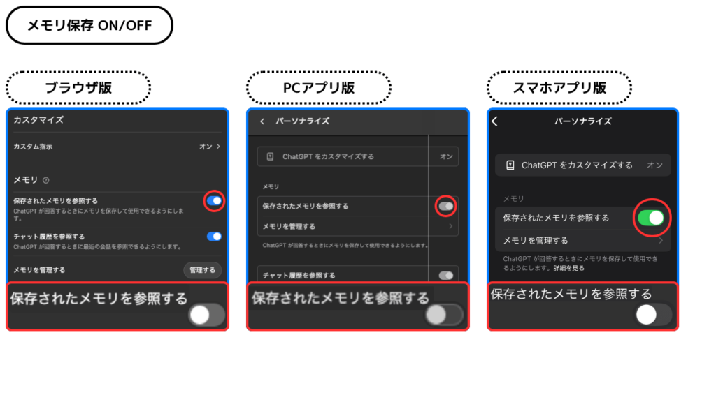 学習利用とメモリ機能、どちらもChatGPTのシステム改善に役立てられてますが、目的・反映方法・影響範囲に大きな違いがあります。