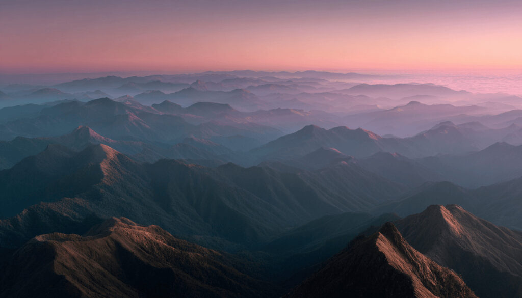 a wide panoramic view of a mountain range at dawn --ar 7:4