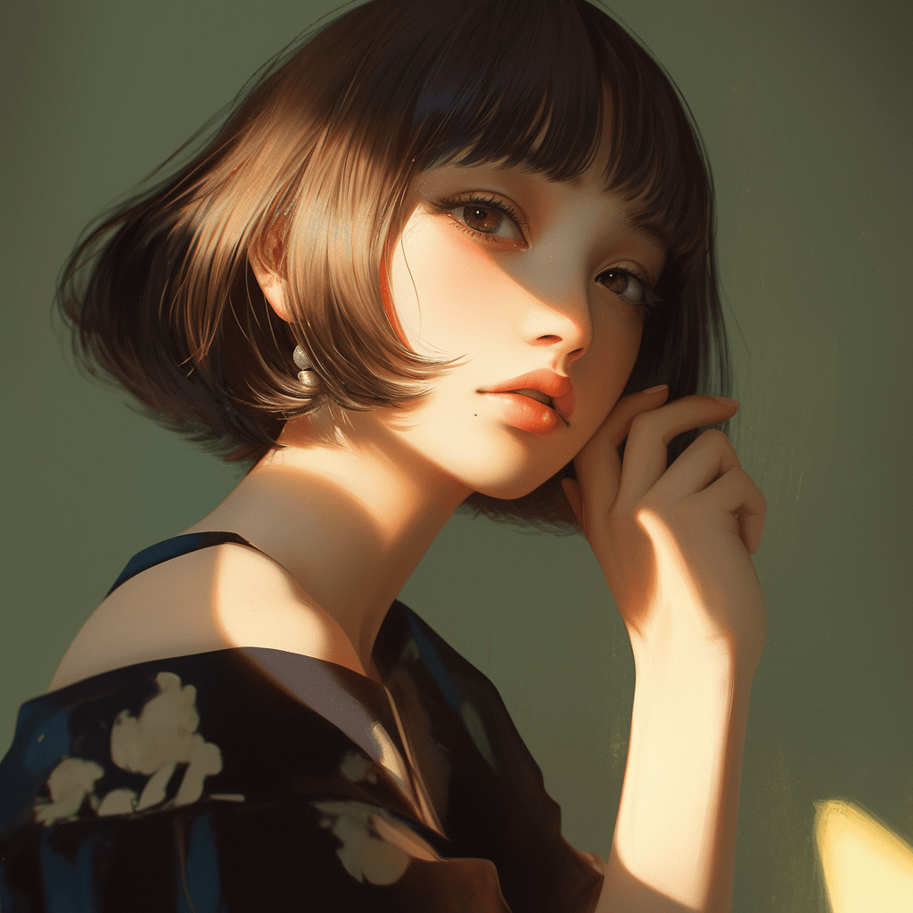 Japanese girl with short bob, chin-length hair, cute expression, bright atmosphere --style raw