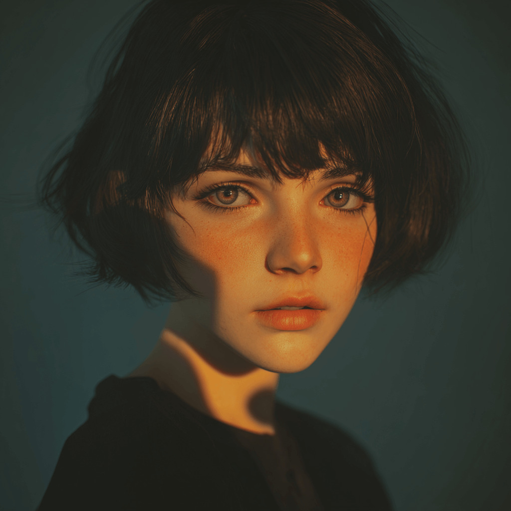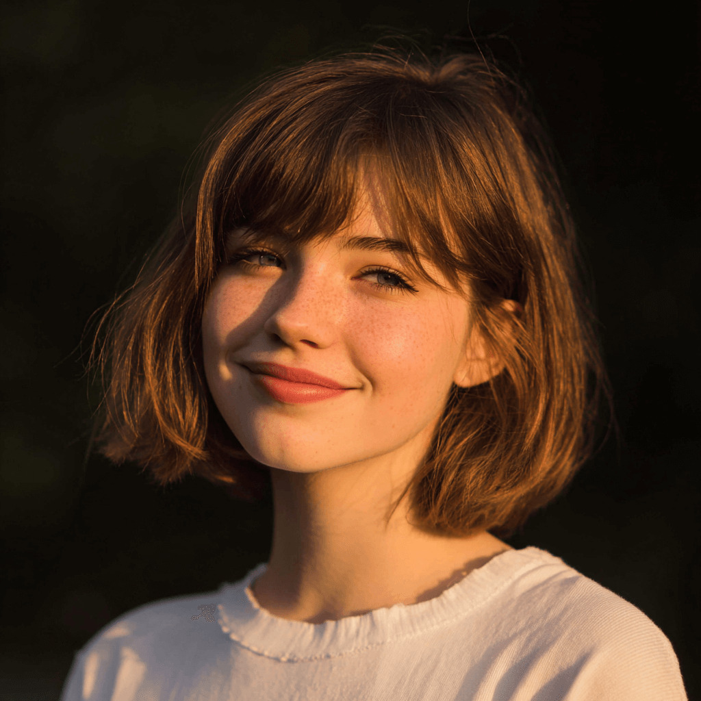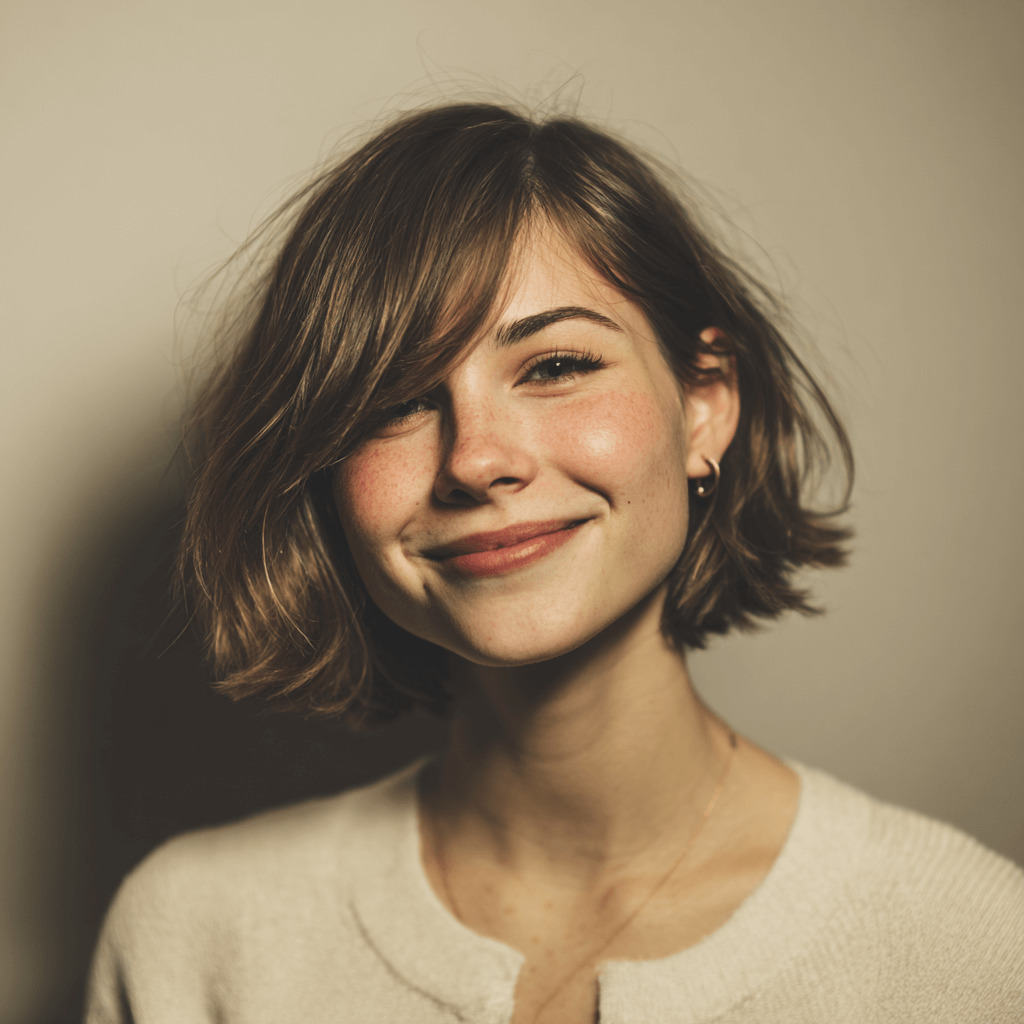 young woman with bob cut, shoulder-length hair, natural smile, soft lighting --style raw