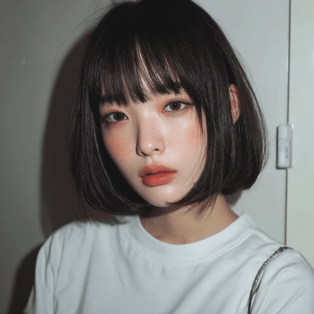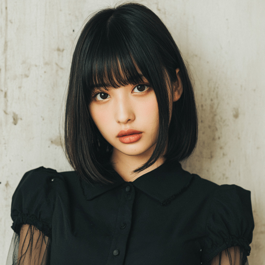 Japanese girl with blunt bangs, straight-cut bangs, bob cut, innocent look --style raw