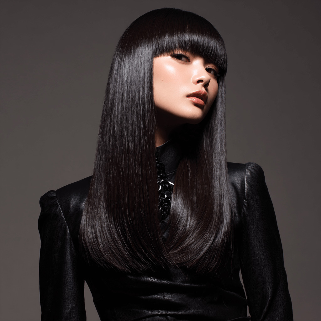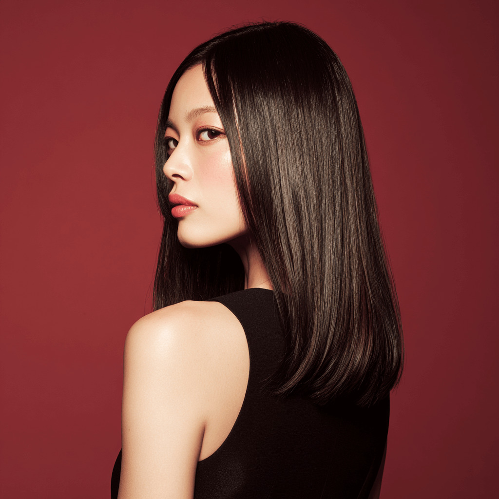 Japanese model with medium-length straight hair, glossy texture, elegant pose, studio lighting --style raw