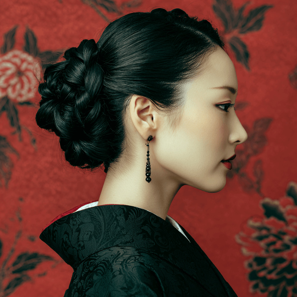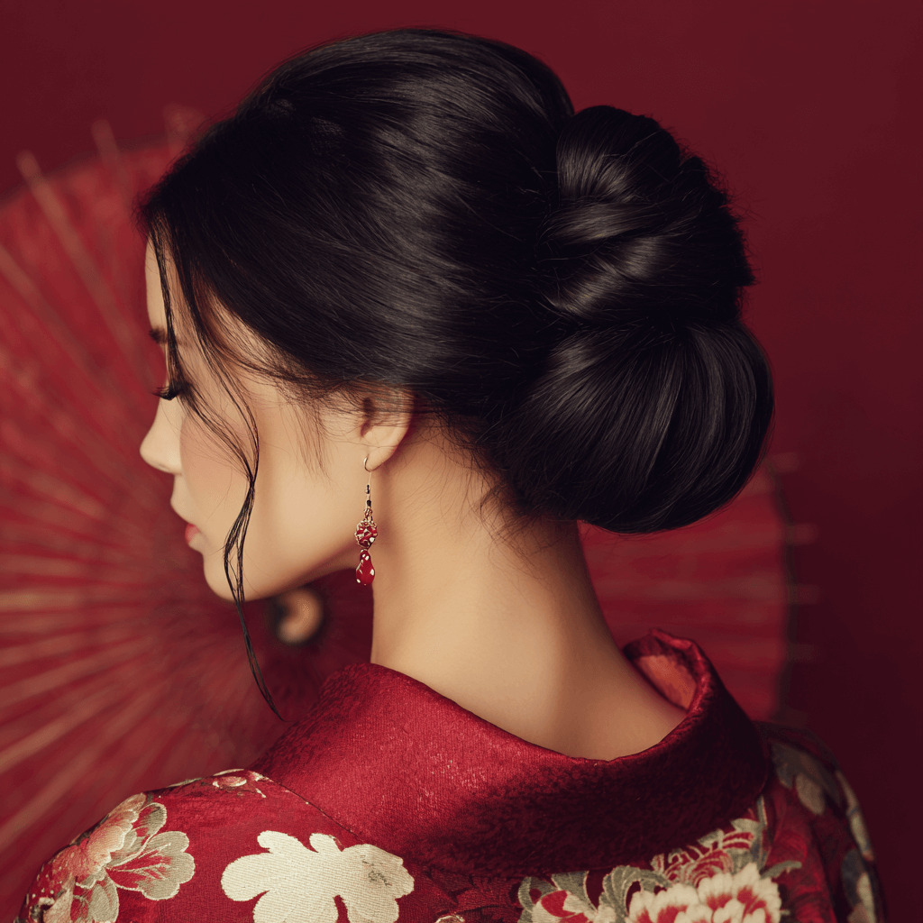 Japanese woman with hair bun, elegant updo, traditional style, refined atmosphere --style raw