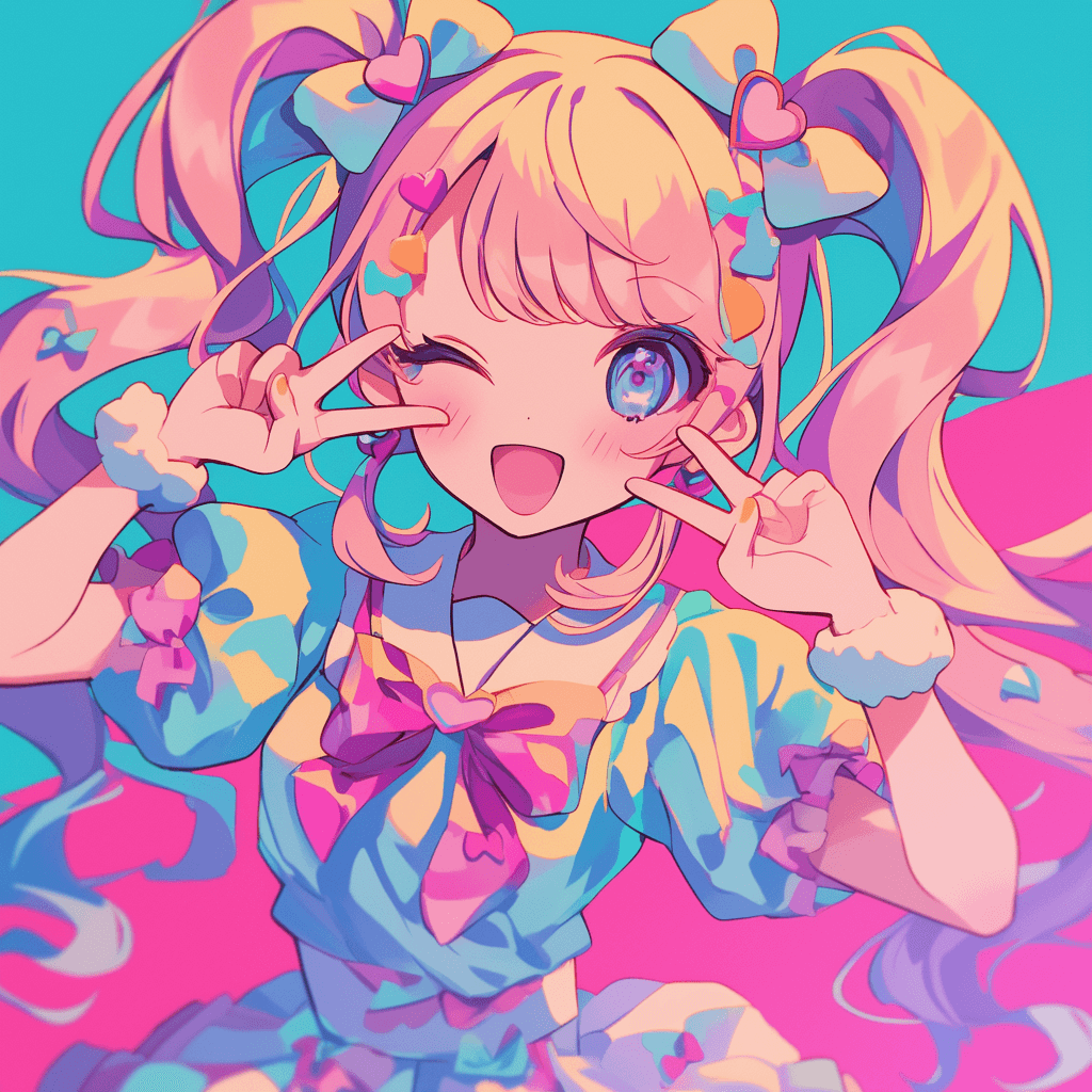 anime character with twintails, twin ponytails, cute pose, colorful background --niji 6
