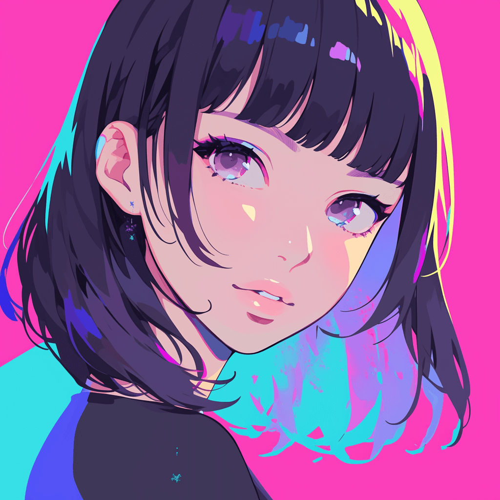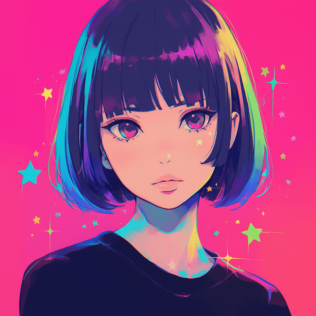 anime girl with bangs, straight bangs, cute expression, colorful background --niji 6