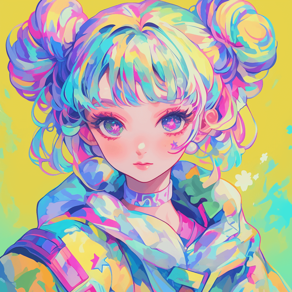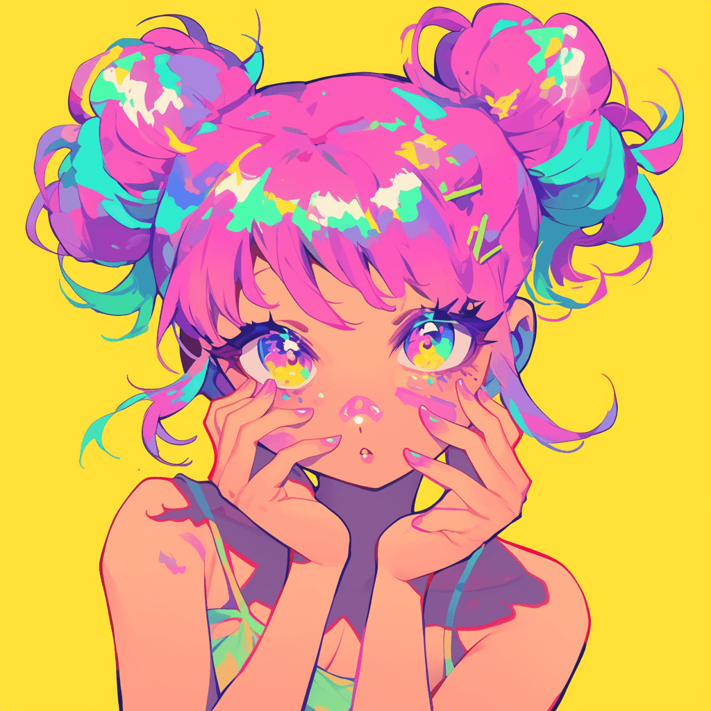 anime girl with double hair buns, space buns, playful expression, vibrant colors --niji 6