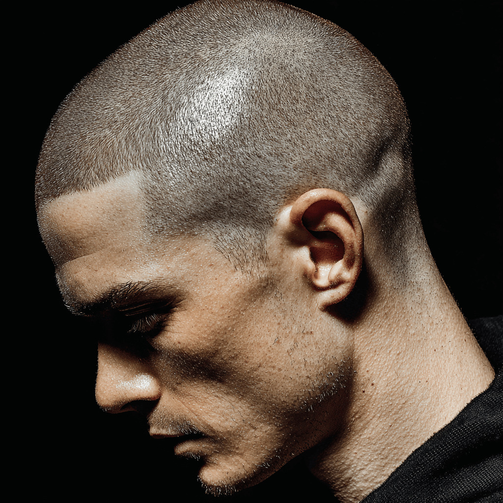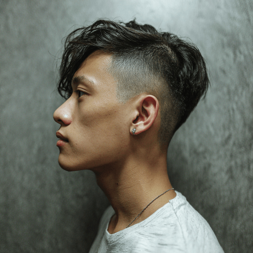 サイドを刈り上げて、トップに長さを残したモダンなスタイル。メンズファッションで人気の髪型で、都会的でクールな雰囲気を演出できます。「刈り上げ」を指定したい場合は、このプロンプトが最も確実に再現してくれますよ。