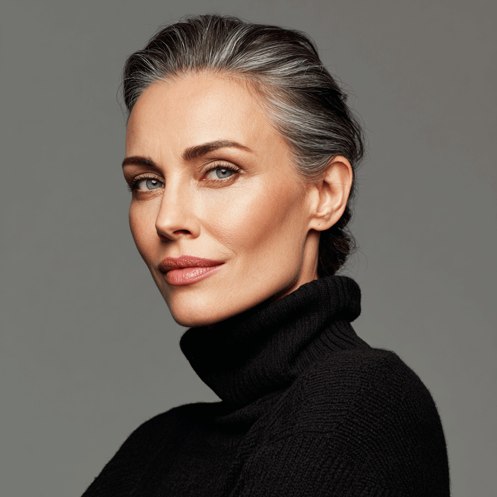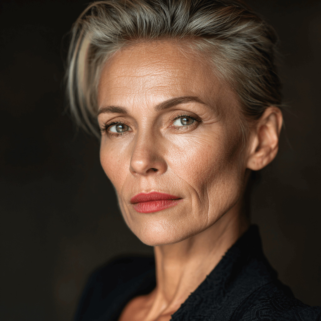 confident woman with no bangs, forehead exposed, slicked back hair, mature style --style raw