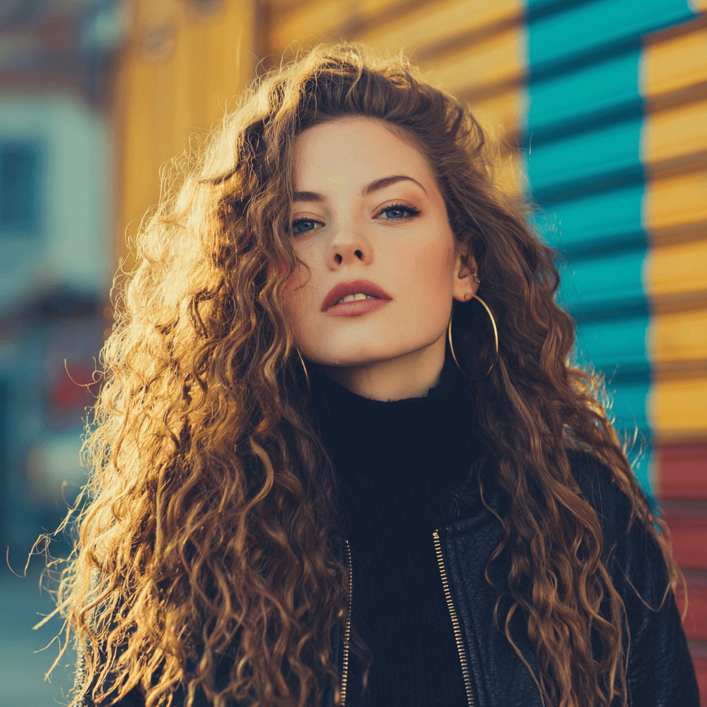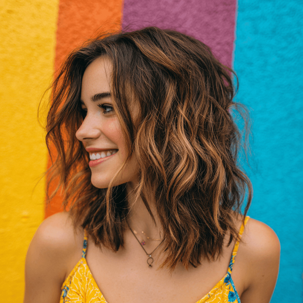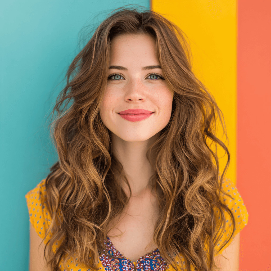 cute girl with medium-length wavy hair, loose waves, cheerful smile, colorful background --style raw