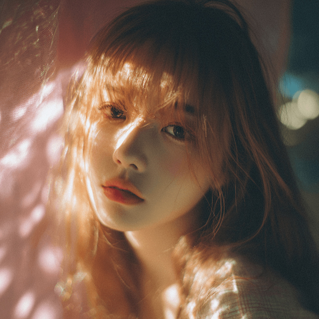 cute girl with wispy bangs, light airy bangs, soft expression, dreamy atmosphere --style raw