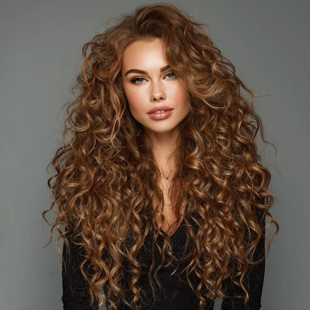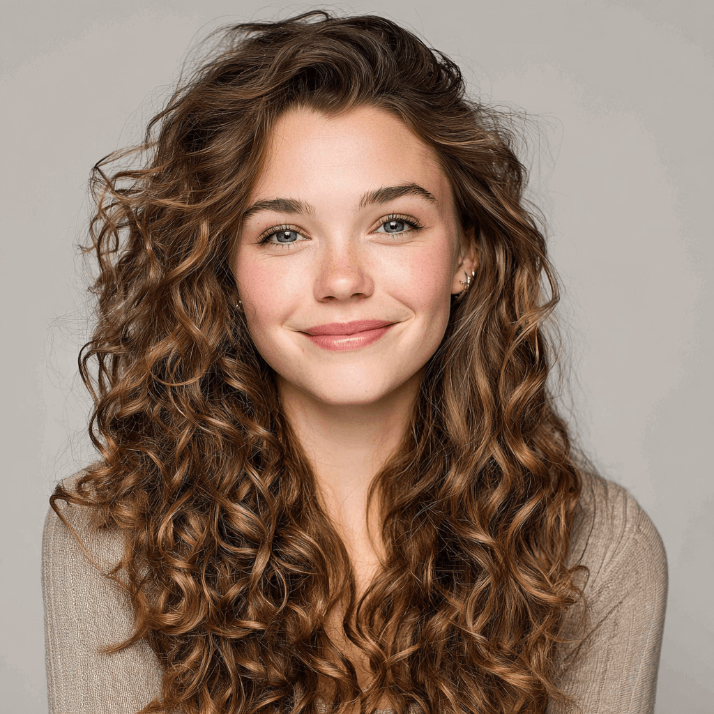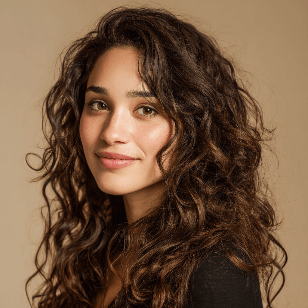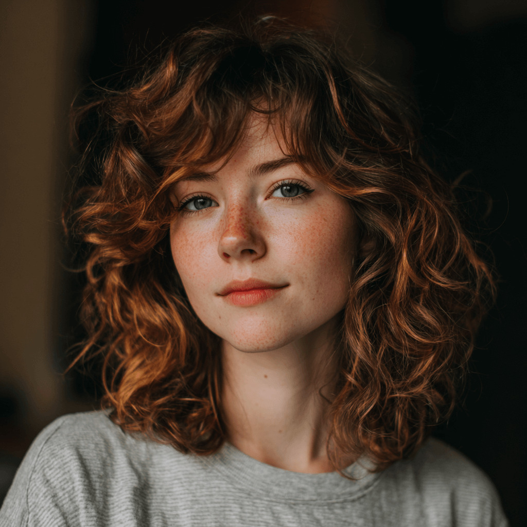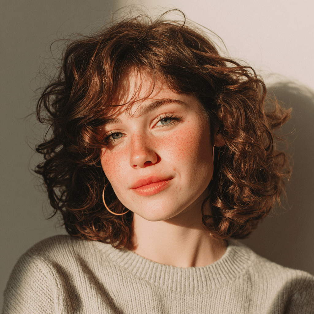 young woman with wavy shoulder length hair, soft curls, gentle expression, natural lighting --style raw