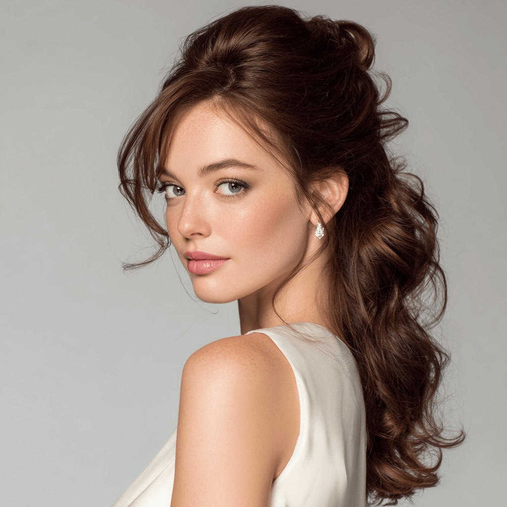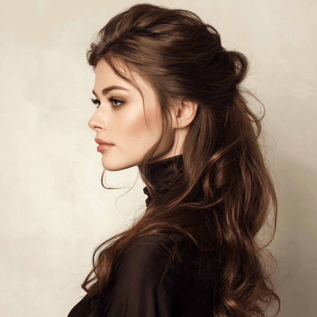 elegant woman with half updo, upper hair tied back, flowing lower hair, sophisticated style --style raw