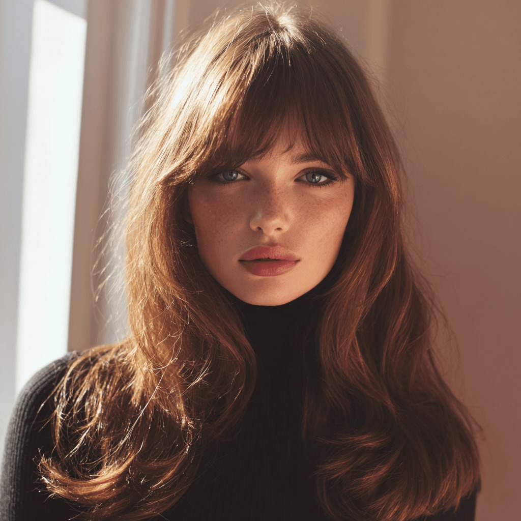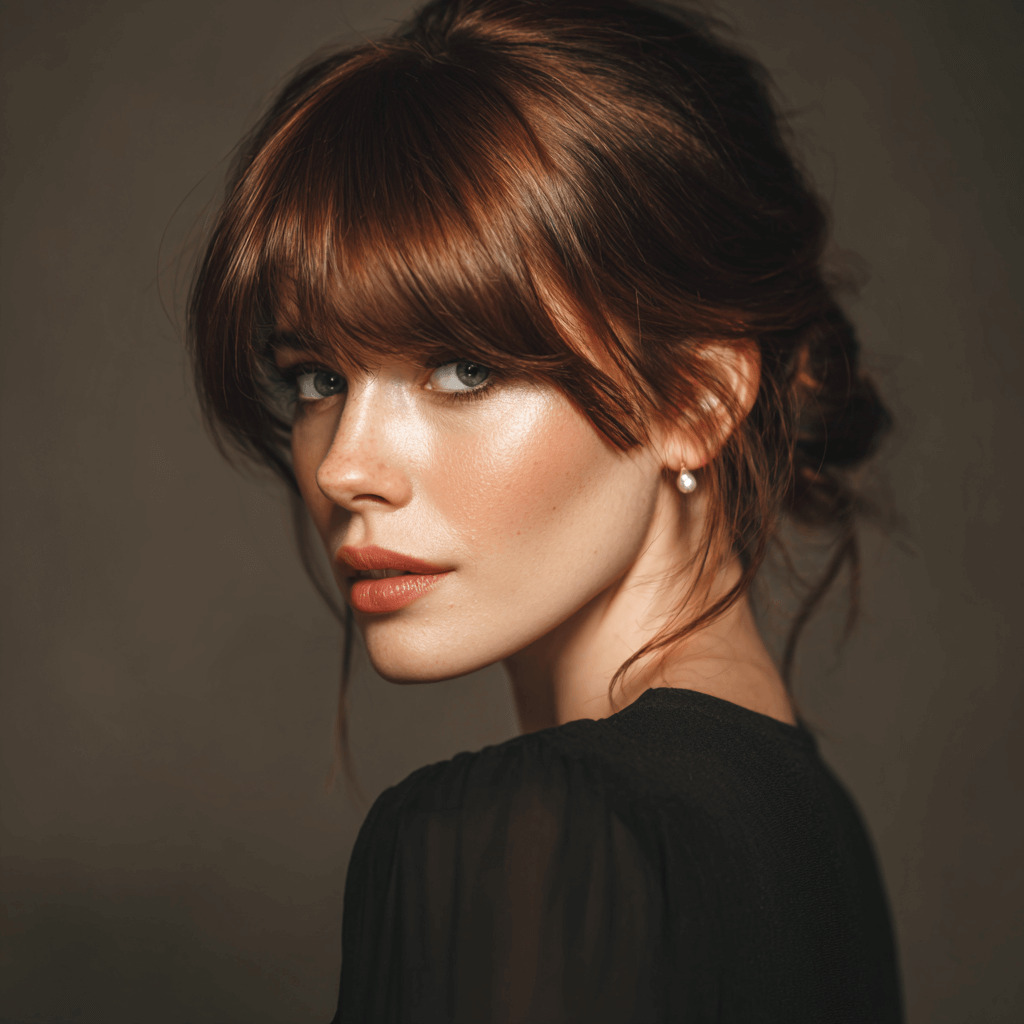 elegant woman with side-swept bangs, hair swept to side, sophisticated style, soft lighting --style raw