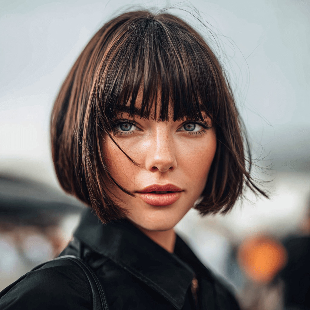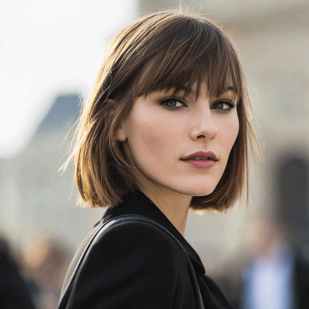 fashionable woman with blunt bob, straight-cut ends, modern style, urban setting --style raw