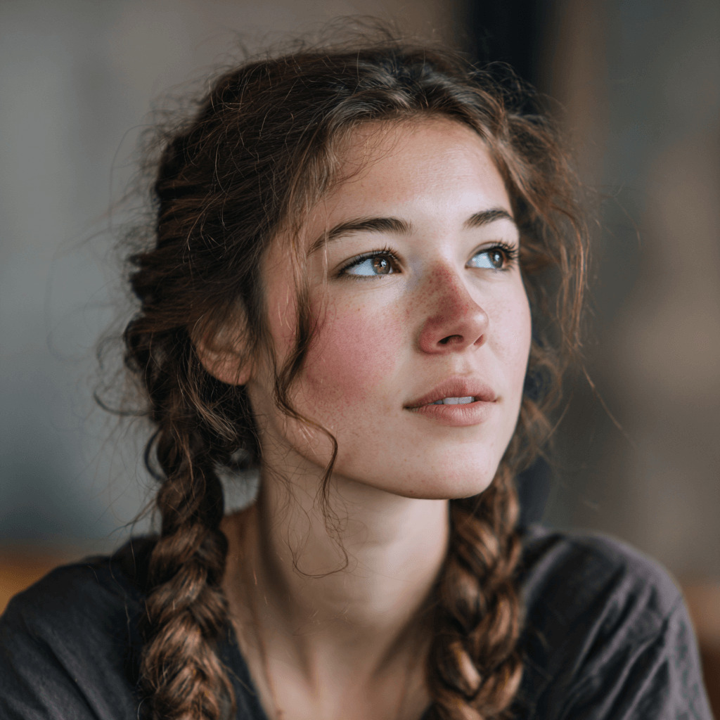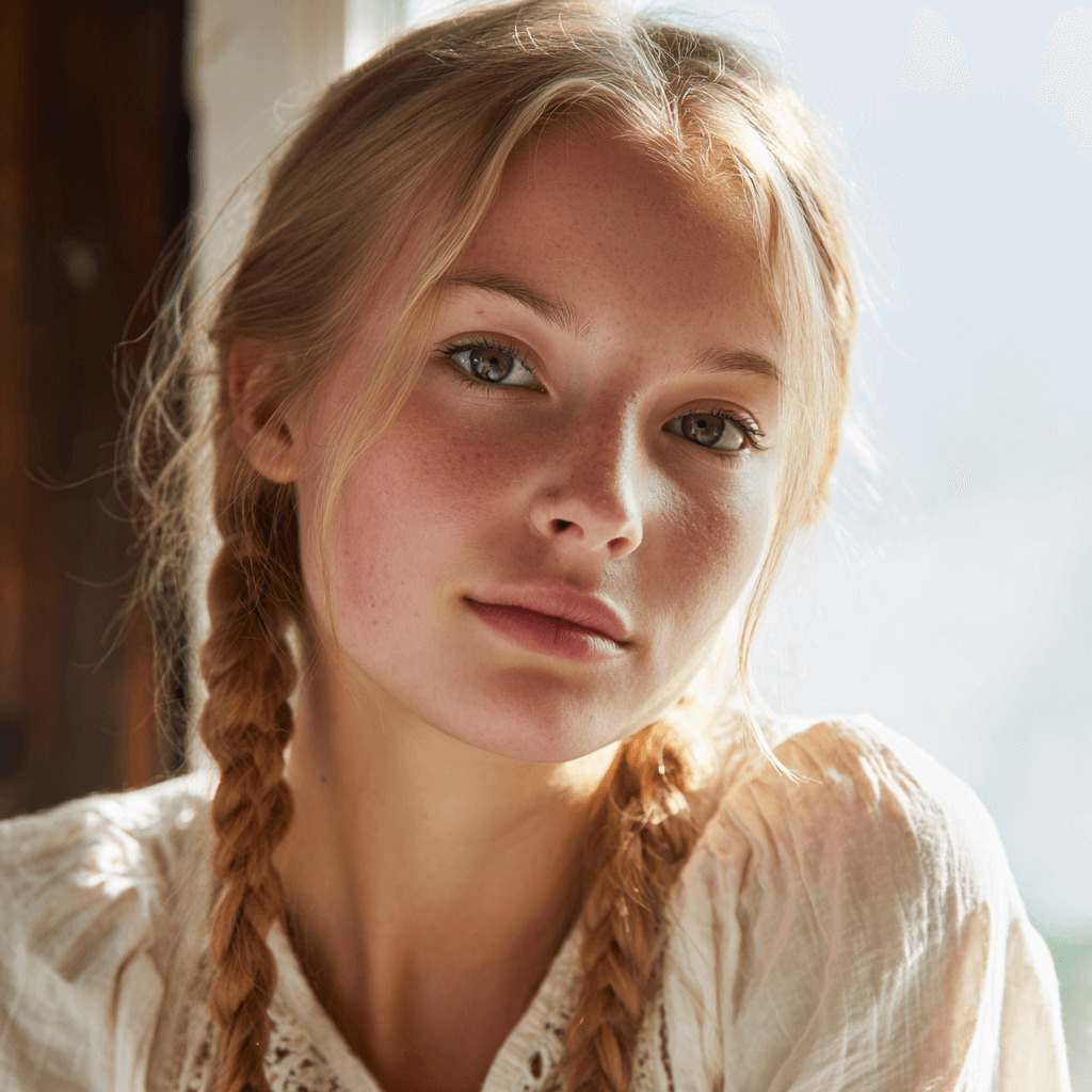 gentle girl with braid hair, single braid, soft expression, natural light --style raw