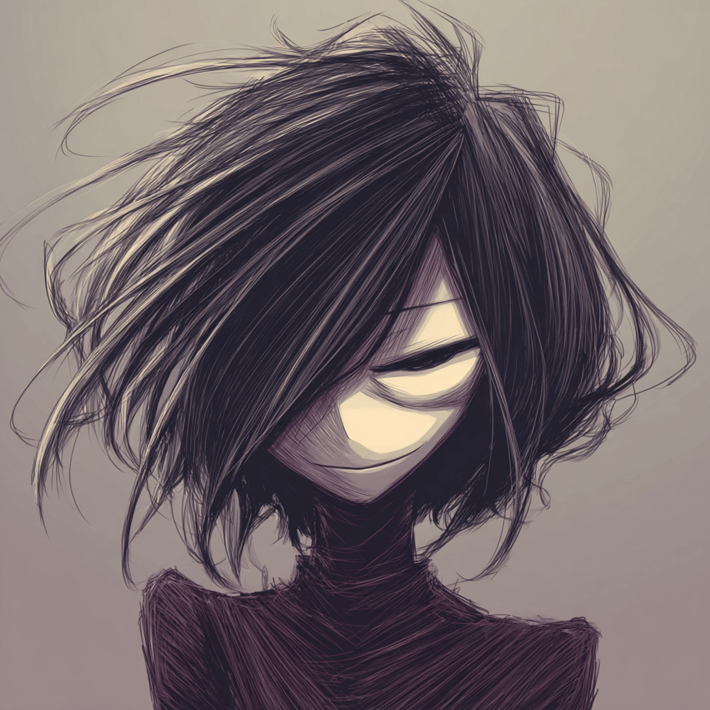 mysterious character with hair over one eye, one eye covered by hair, cool expression --style raw