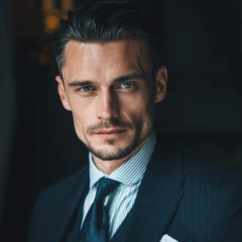 前髪を上げておでこを出したスタイルは、清潔感と自信に満ちた印象を与えます。slicked back(オールバック)と組み合わせると、よりクールなビジュアルになりますね。大人びたキャラクターや、知的な雰囲気を出したい時に最適です!