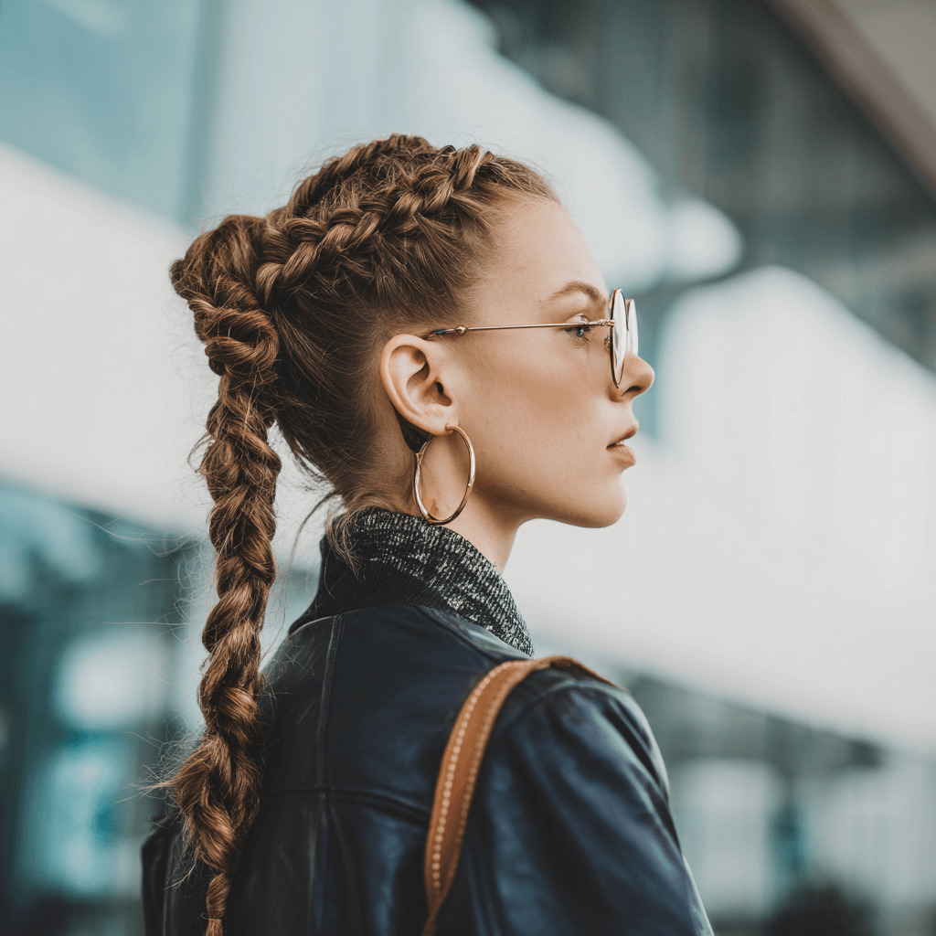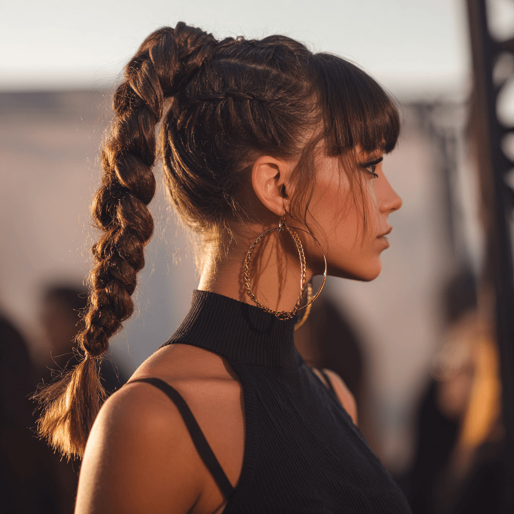stylish girl with braided ponytail, intricate braid, trendy fashion, modern atmosphere --style raw