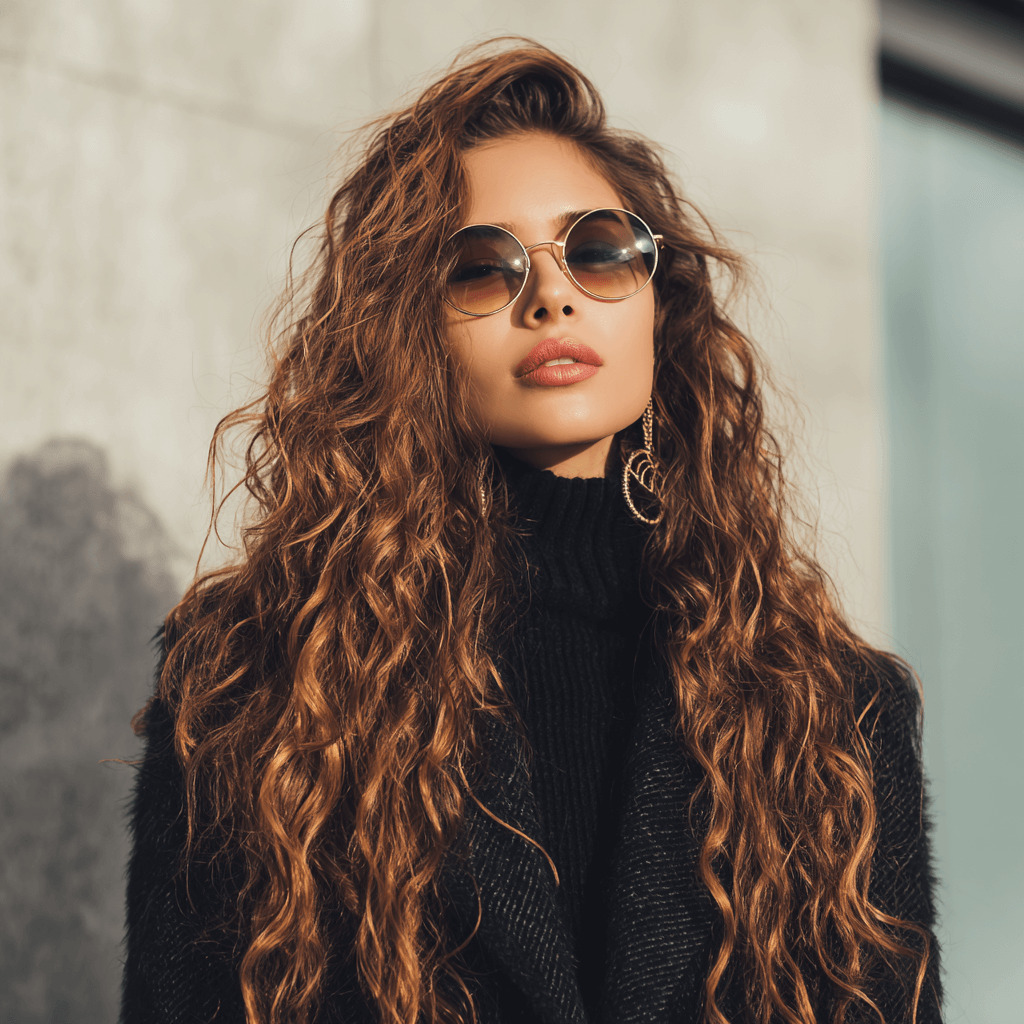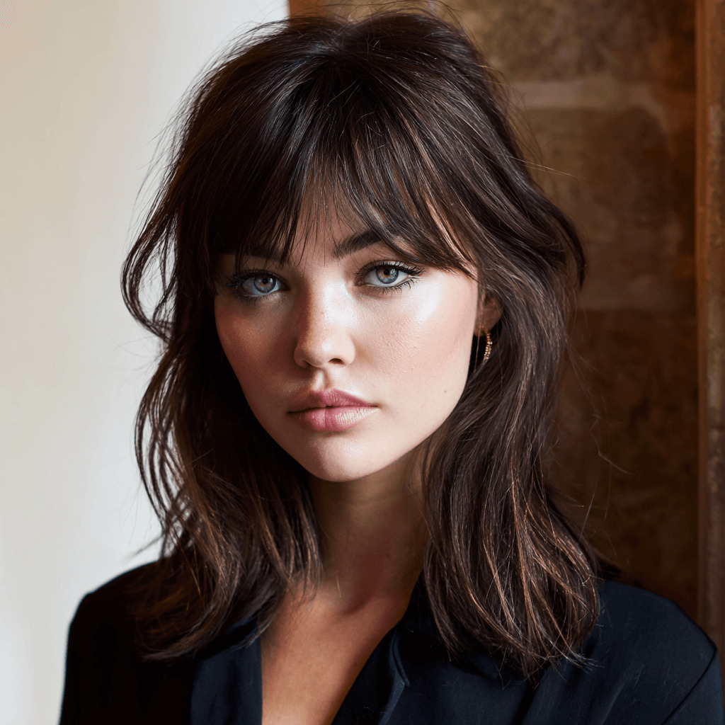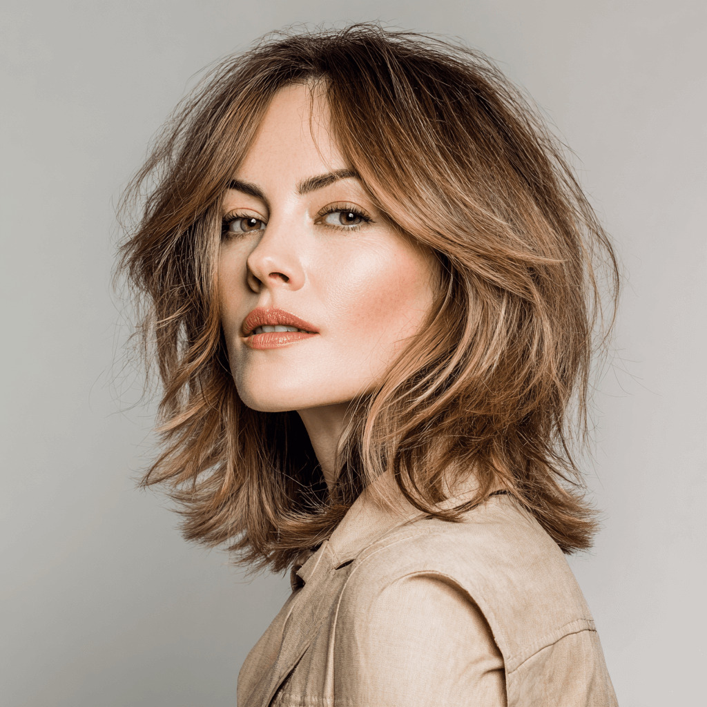 stylish woman with layered medium hair, textured layers, confident expression, fashion portrait --style raw