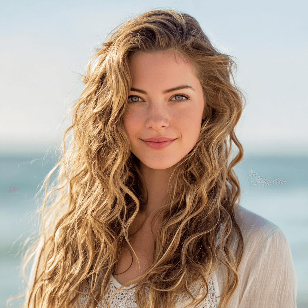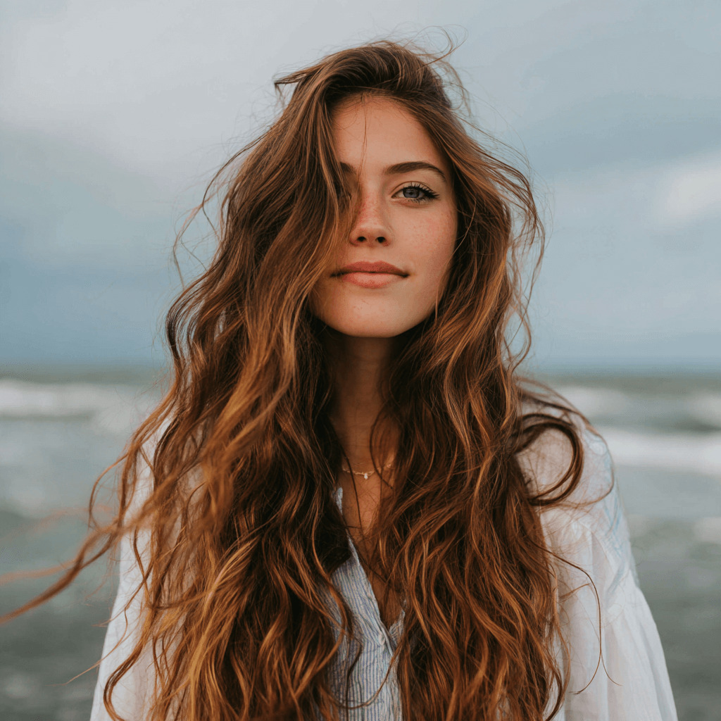 young woman with wavy long hair, soft waves, flowing hair, beach setting --style raw