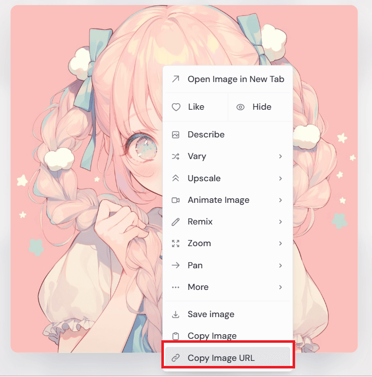 まず、理想のキャラクターを一枚生成し、その画像URLをコピーします。