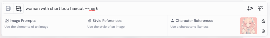 例:woman with short bob haircut --cref [画像URL] --niji 6