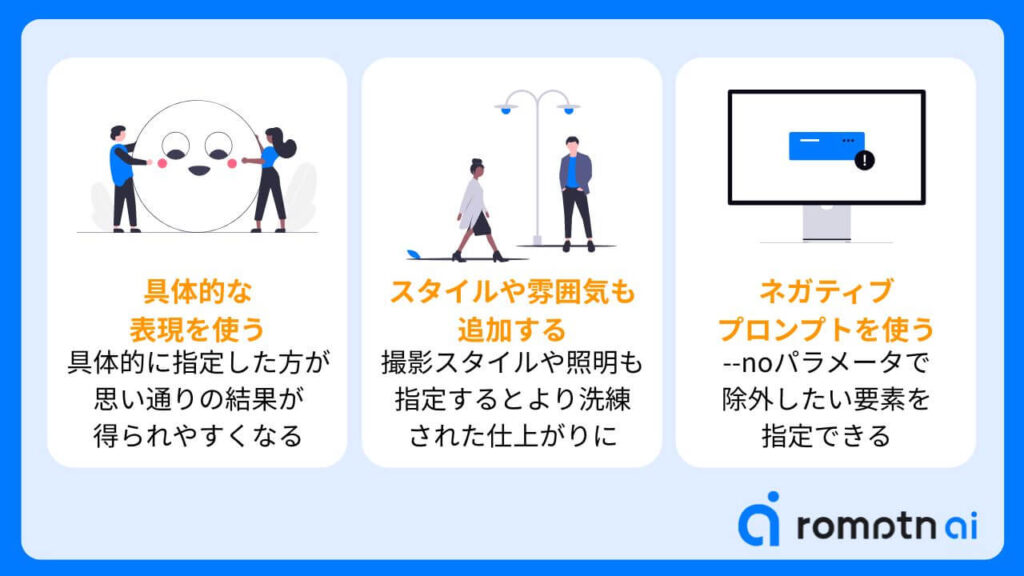 ③不要な要素はネガティブプロンプトで除外:意図しない髪型が生成される場合は、ネガティブプロンプトを活用しましょう。Midjourneyでは--noパラメータで除外したい要素を指定できます。