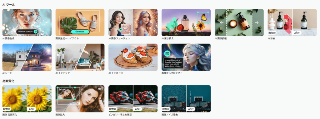 AI機能(制限あり) | ・AI画像生成(1日3クレジットまで) ・背景削除・切り抜き(1日1回まで) ・画像高画質化(1日1回まで) ・AIアニメ化・イラスト化(クレジット消費) |