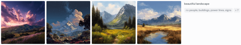 正しいプロンプト例:beautiful landscape --no people, buildings, power lines, signs
