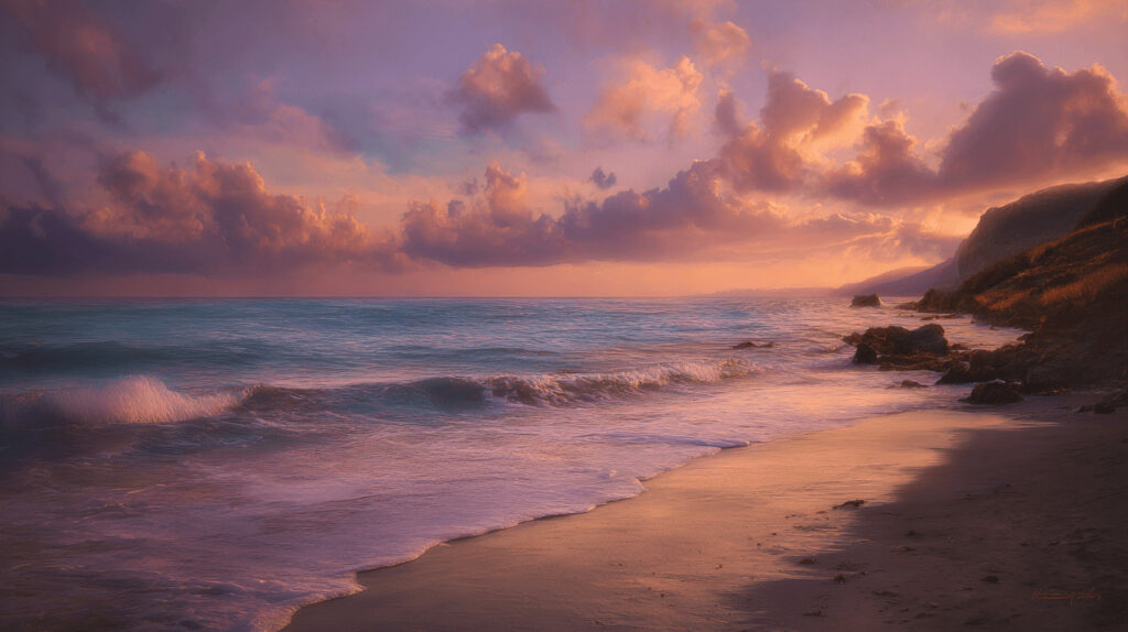 peaceful beach sunset --no people, buildings --ar 16:9