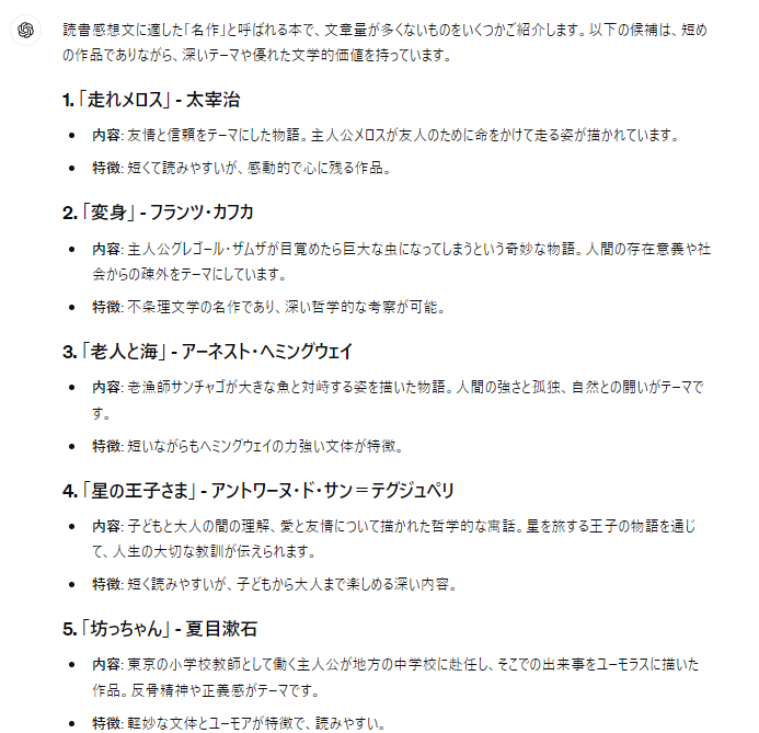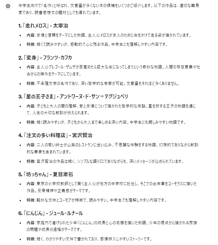 まずは、読書感想文で使う本を選びましょう。青空文庫(著作権が切れた本を紹介しているサイト)で探してもらっても良いのですが、それすらも面倒な場合はChatGPTに聞いてしまいましょう。