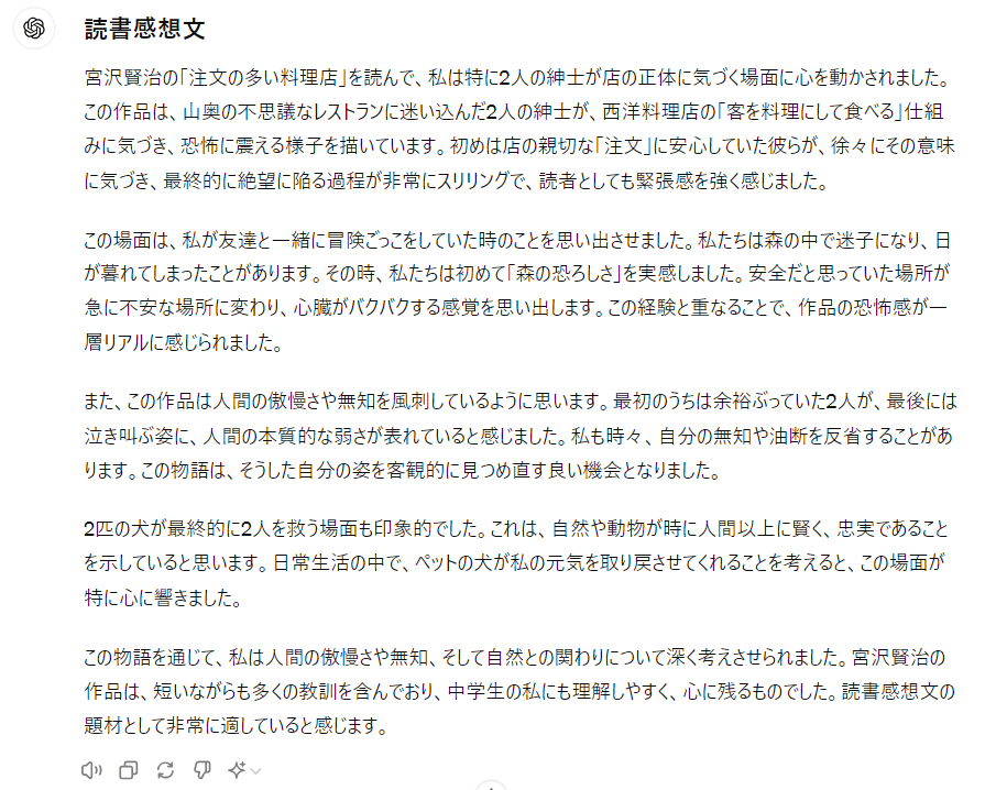 以下がChatGPTが作ってくれた読書感想文の出力です。