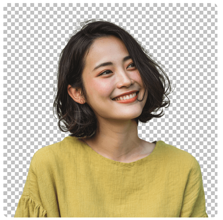 白背景のおかげで、髪の毛の細かい部分まできれいに切り抜かれています。服の白い部分も被写体として認識されて、背景だけがしっかり透過されていますね。