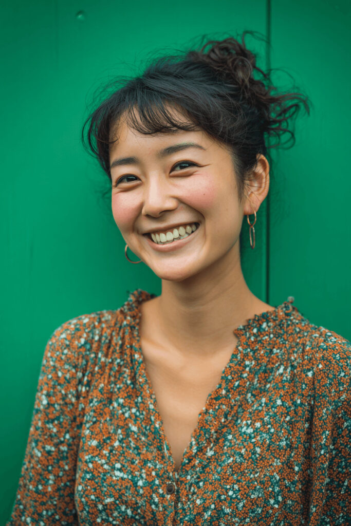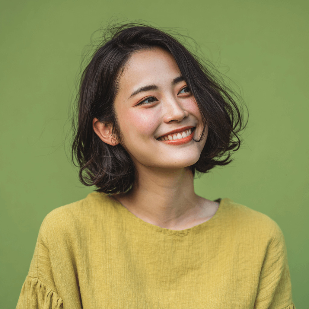 portrait photo, Japanese woman, smile, casual clothes, simple green background, focus on the person --ar 2:3 --v 7