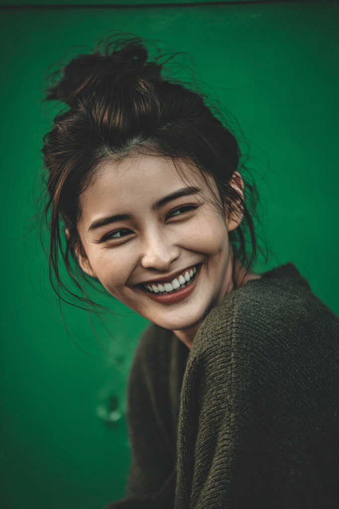 プロンプト例:portrait photo, Japanese woman, smile, green background --ar 2:3 --v 7